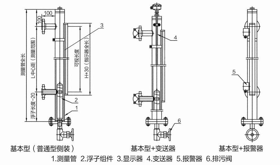 由連通器、主導管、磁性浮子、現場指示牌,及捆綁式液位變送器或液位開關組成。