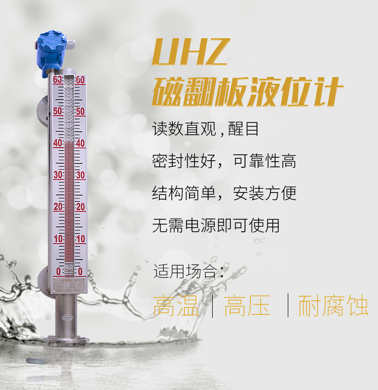 UHZ磁翻板液位計是具有可靠的安全性的檢測儀表,由于具有磁性藕合的隔離密閉結構。尤其適用于易燃、易爆和腐蝕有毒液體的液位檢測。從而使原復雜環境的液位檢測手段變得簡單和可靠和可靠安全。